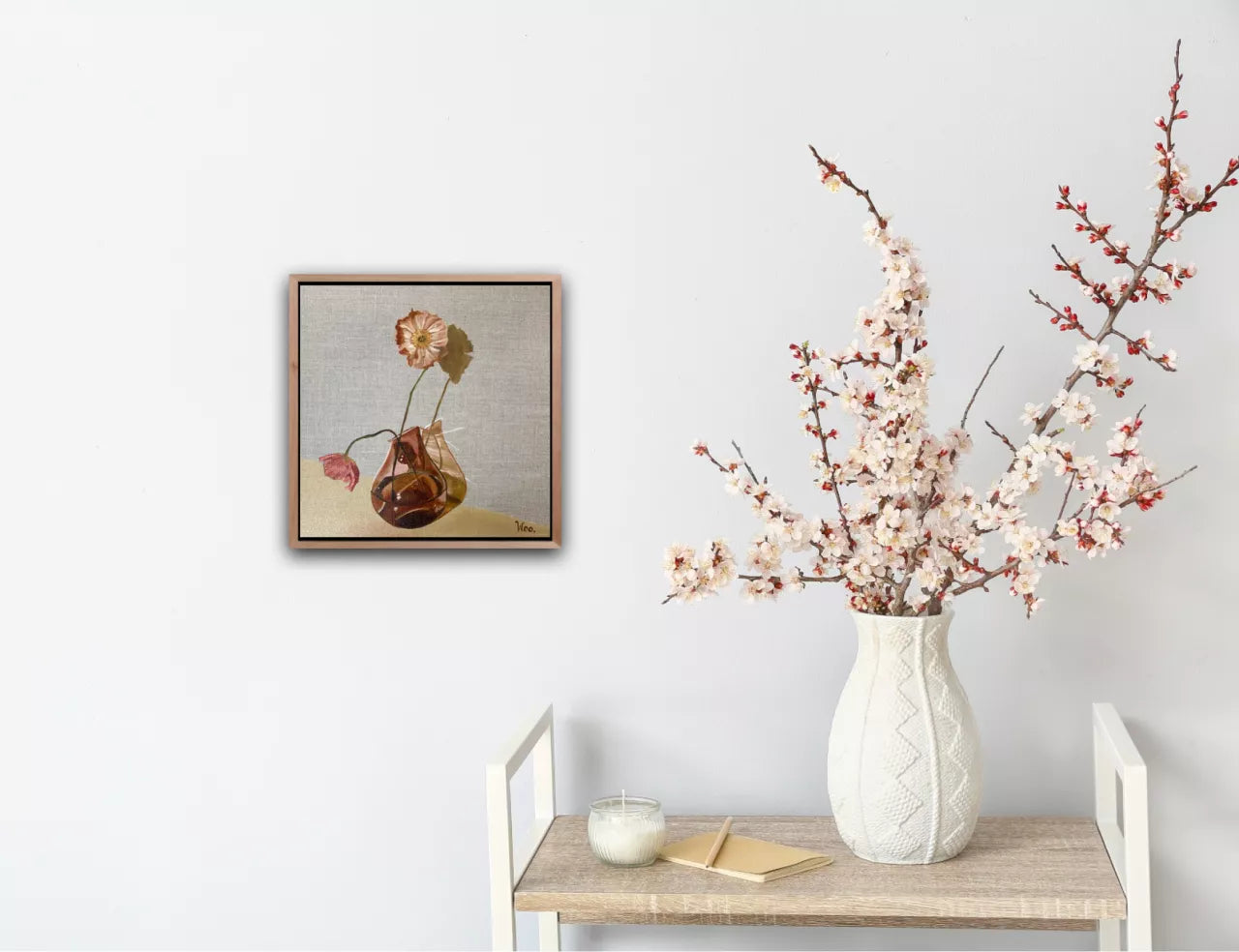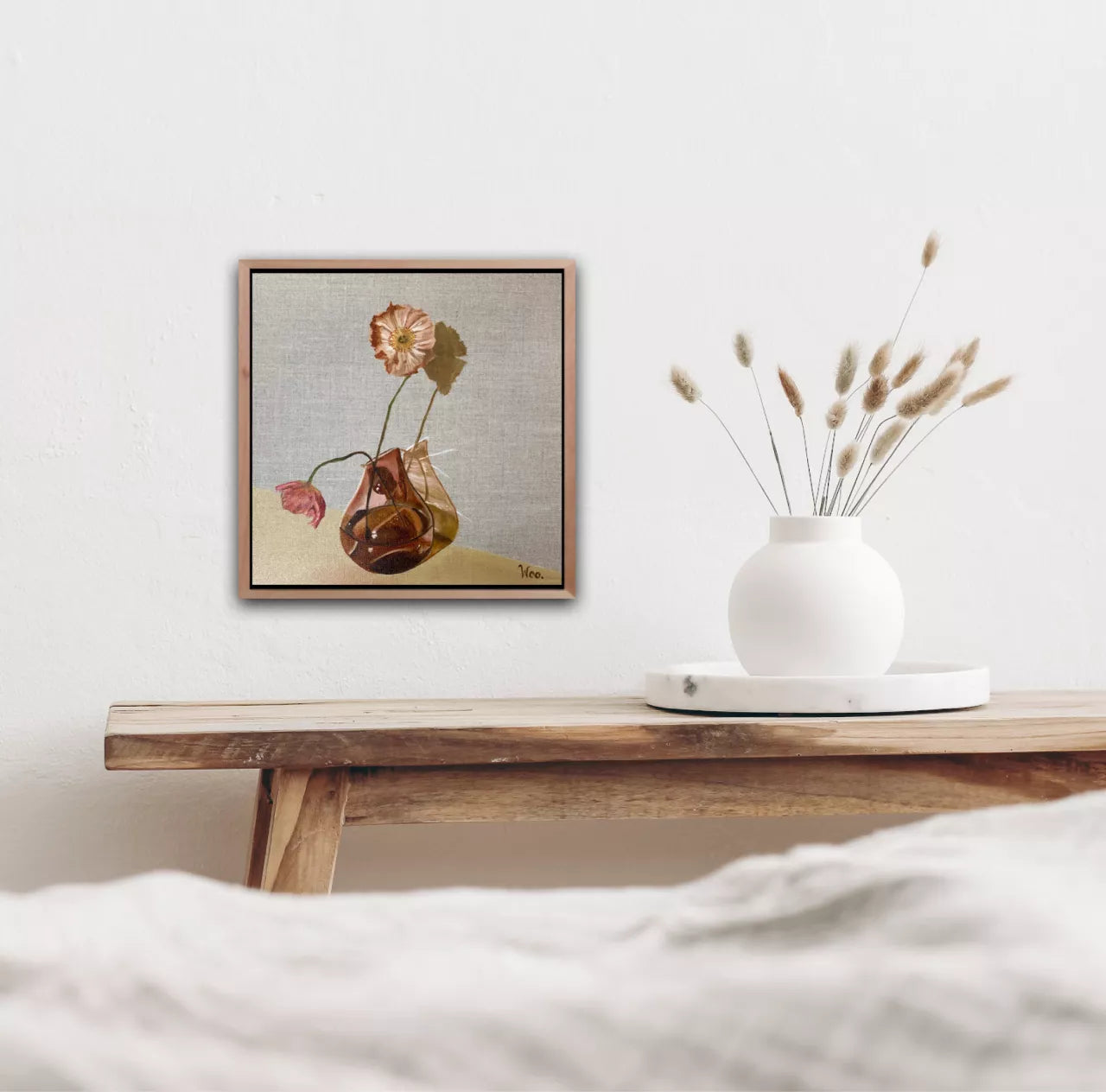 When peachy amber poppies and amber glass are set together it is a marriage made in heaven. I saw a bunch of beautiful Icelandic poppies in the florist and just had to buy them and use my rose amber glass vase to create this beautiful still life on linen.