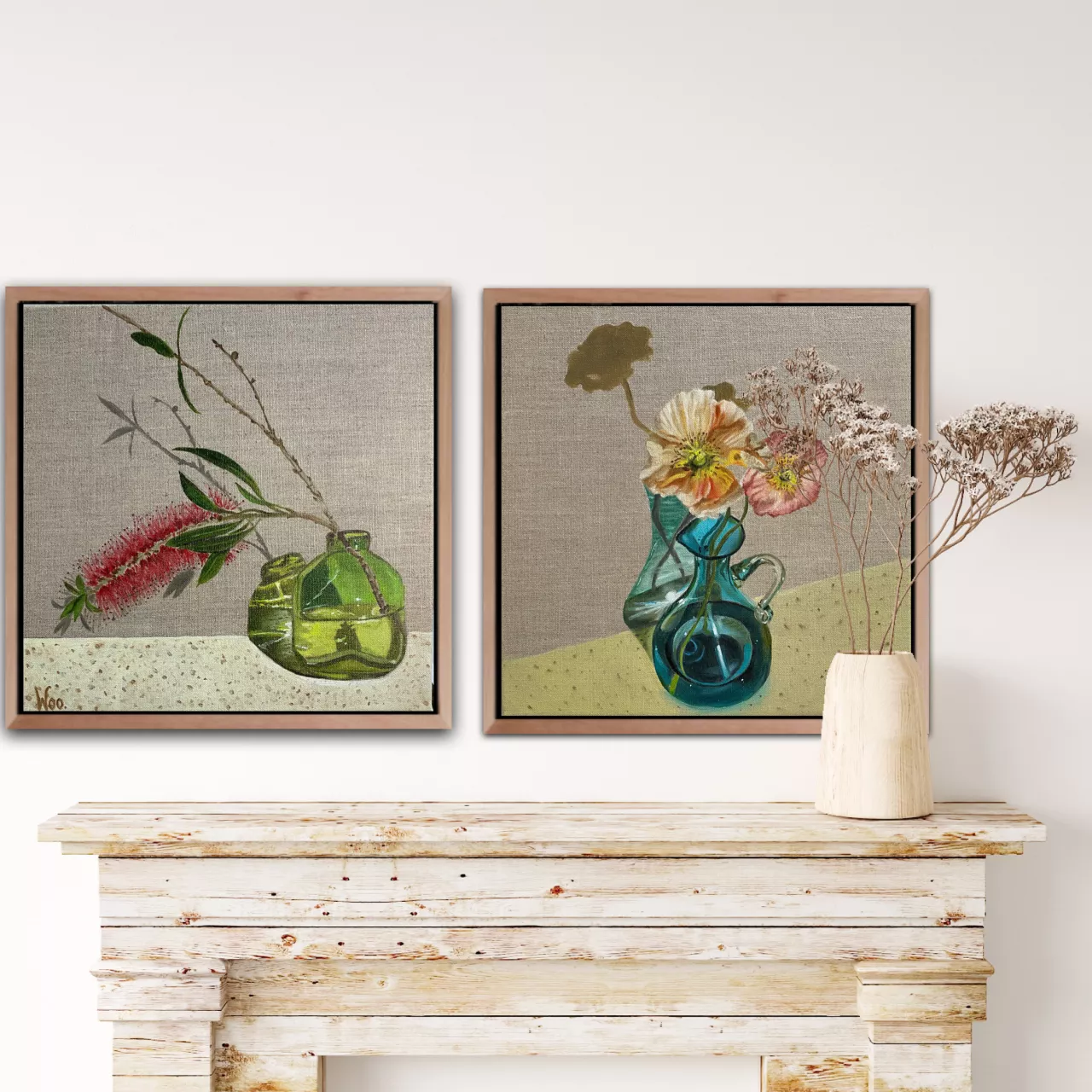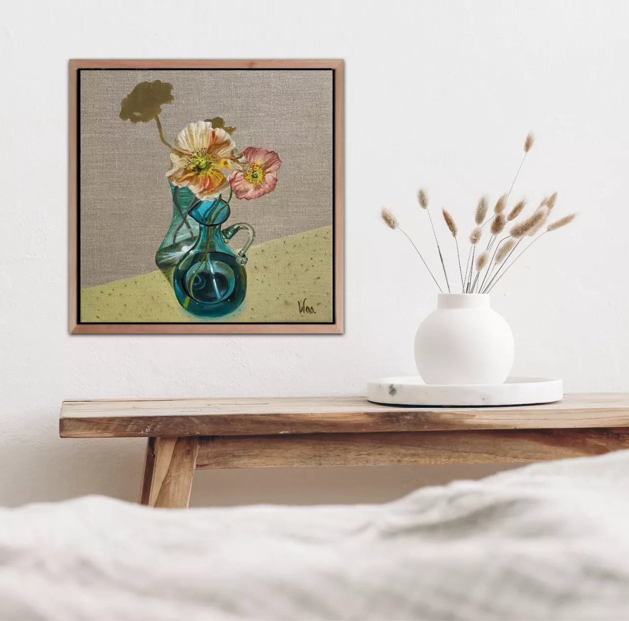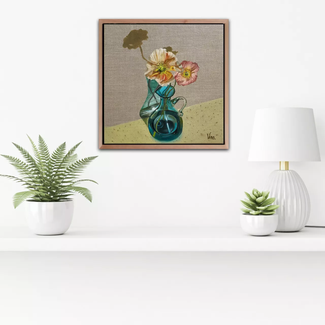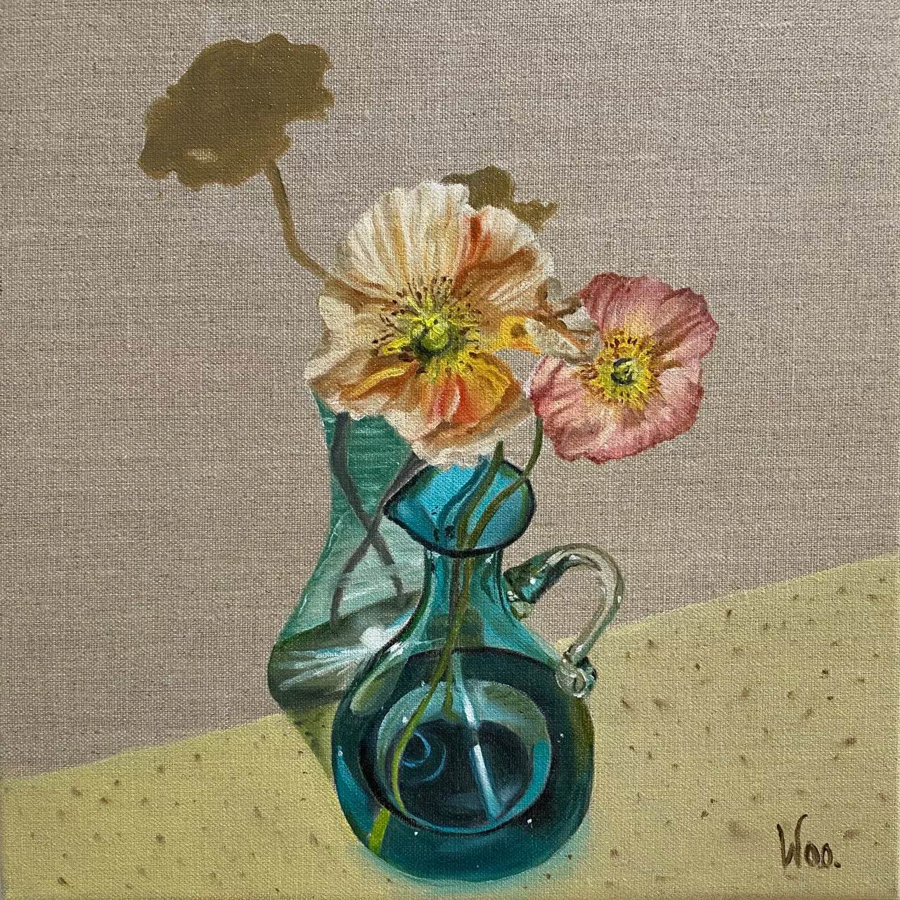This small painting highlights the reflections glass makes when sunlight bounces through making sparkles and shadows. Add some poppies and Aqua Cadabra, magic happens