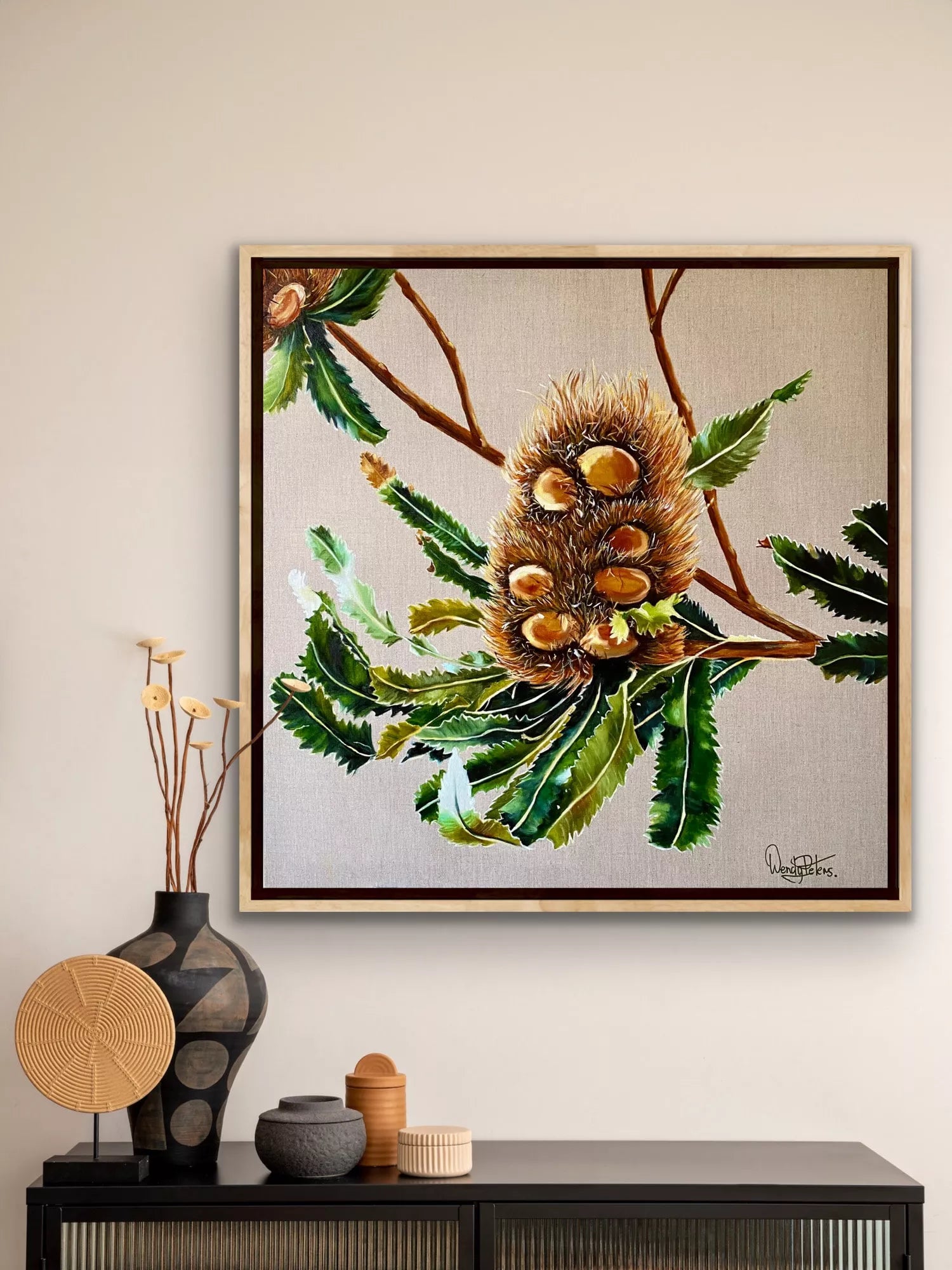 The Banksia Serrata's unique texture fascinates me. I wanted to translate its tactile qualities and rich colours onto the canvas, highlighting the textures from the delicate spines, serrated leaves, to the robust woody stem. The natural linen canvas provides the perfect foundation for this textural exploration.Framed in a high quality raw oak float frame. The actual painting measures 76cmx76cmSupplied with a Certificate of Authenticity.