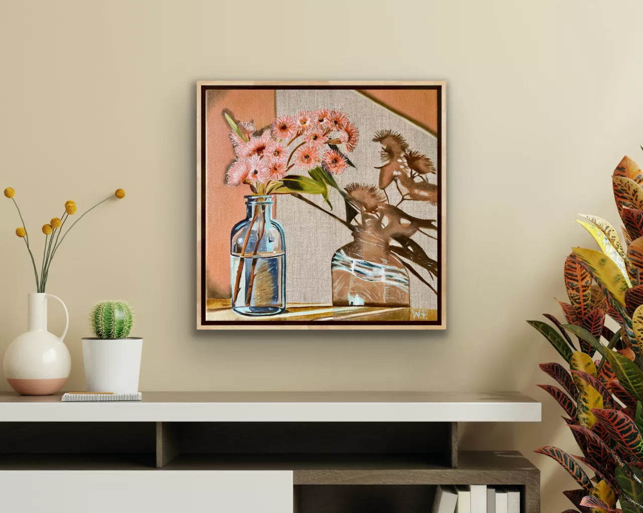 Capturing the beauty of a blue glass vase with a sprig of coral gum nut flowers, bathed in the warm glow of sunlight. The delicate reflections cast upon the wall create a mesmerising interplay of light and shadow, enhancing the overall sense of tranquillity and beauty. Framed in a high quality raw oak float frame. Would look fabulous as a triptych with Purple Haze and Gum Nut Reflections. Supplied with a Certificate of Authenticity. Thank you for viewing Blue Vase and Gum Nuts, I hope you love it.
