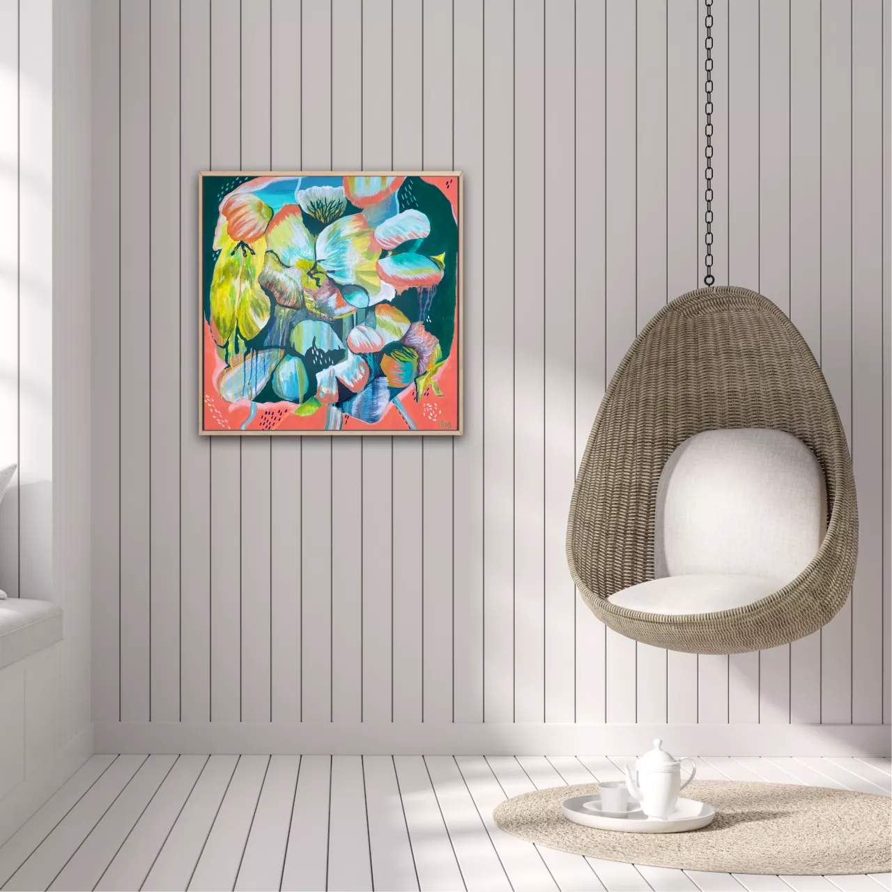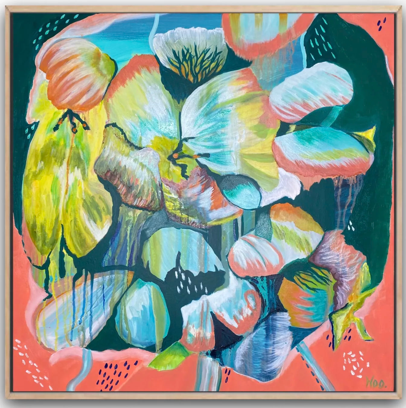 Reminiscent of snorkelling in the Great Barrier Reef. All those incredible vibrant colours. Would so love to visit again, was a truly beautiful experience, maybe next year. Mixed Media on canvas. Signed on the front. Framed In a natural Tasmanian oak float frame with wire across the back.