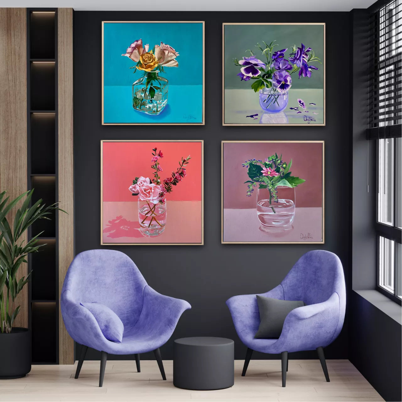 2 beautiful coral roses and 2 stems of small carnations sitting in an everyday glass, create a stunning effect with the glass reflections against a deeper coral background.  Framed in a Tasmanian oak float frame.