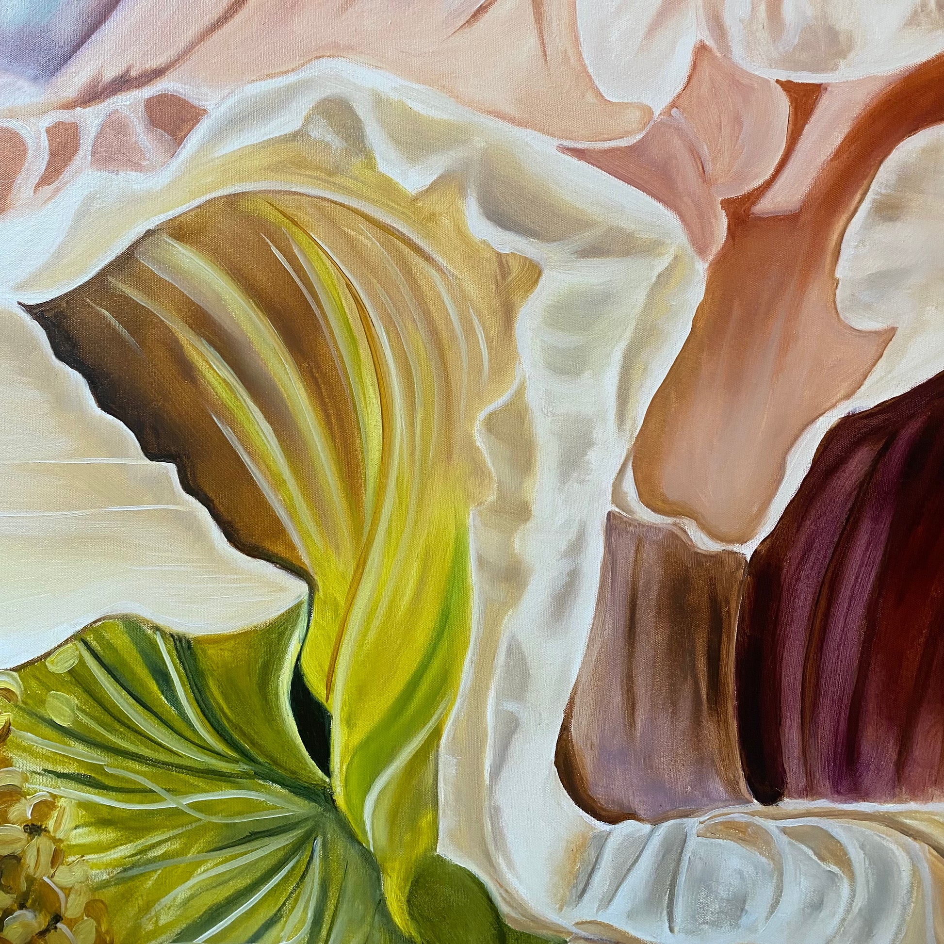 This artwork features several poppies in rich tones of pink, sienna, and lilac. I focused on a detailed study of the petals, emphasizing their folds and pleats to create a vibrant, three-dimensional effect.