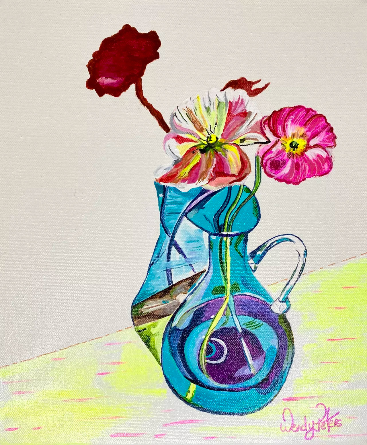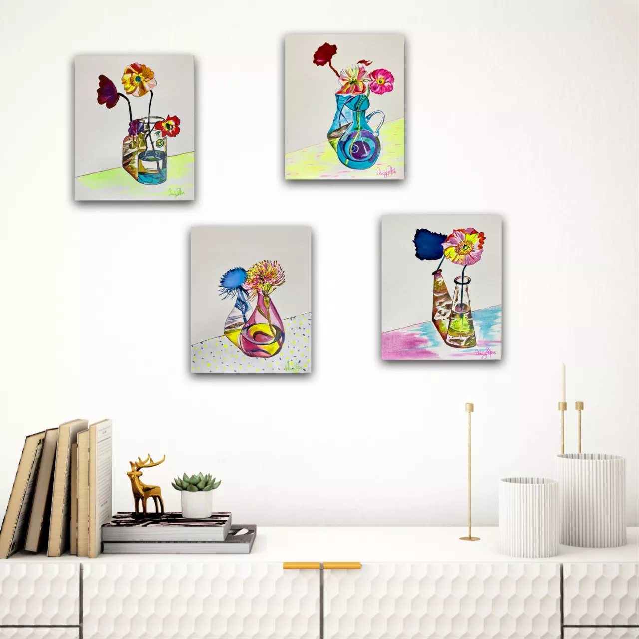 I love reflections and how the light plays through glass creating shadows, the inspiration for this collection came from photos I have taken of some of the vessels I collect, I have previously painted them as realism but this time changing up the colourways for fun. Adding a dash of fluro for that extra pop of colour.