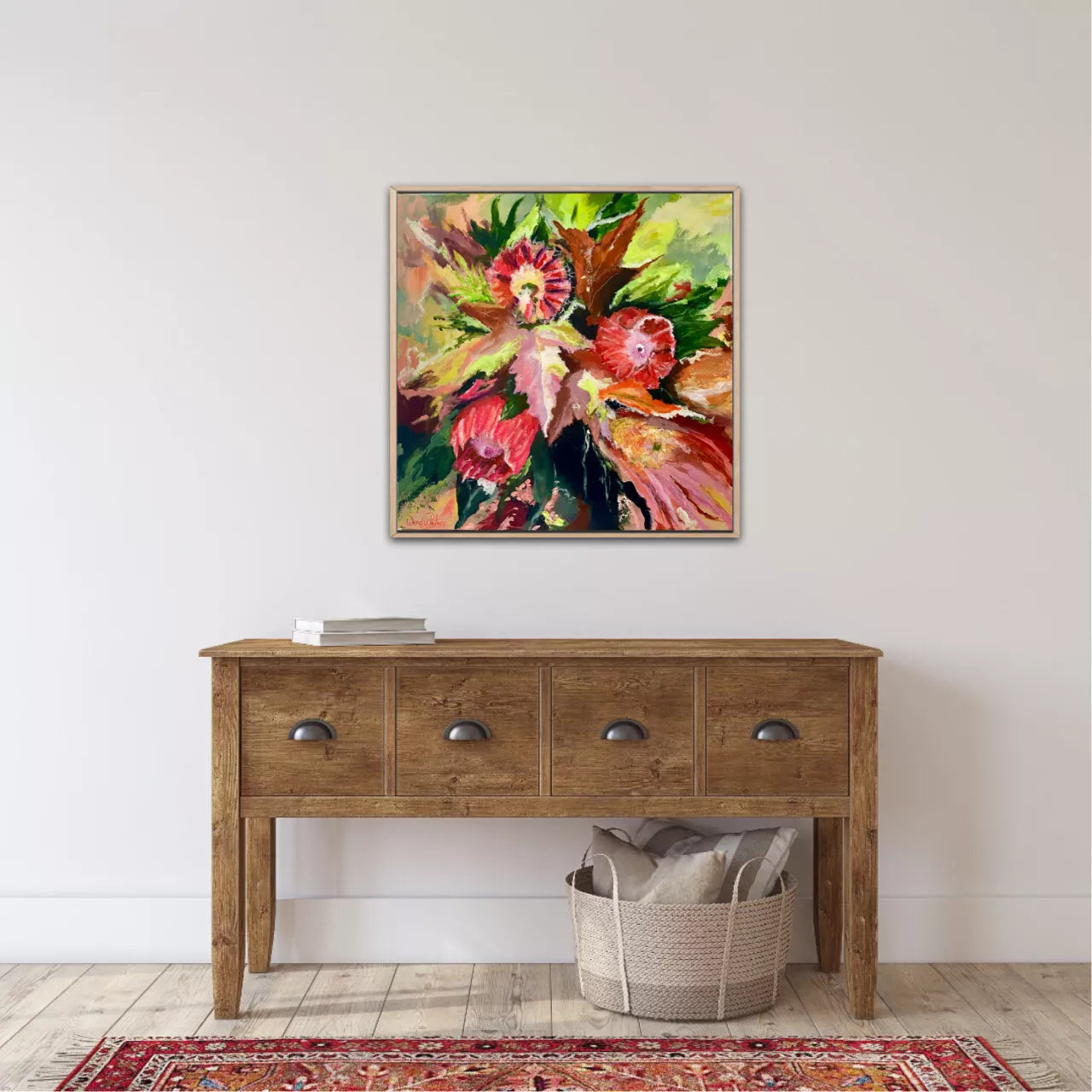 Embracing the unique charm of Australian flowers through an abstract lens, using bold strokes and a palette inspired by the country's diverse floral landscapes. Available exclusively from Bluethumb art.