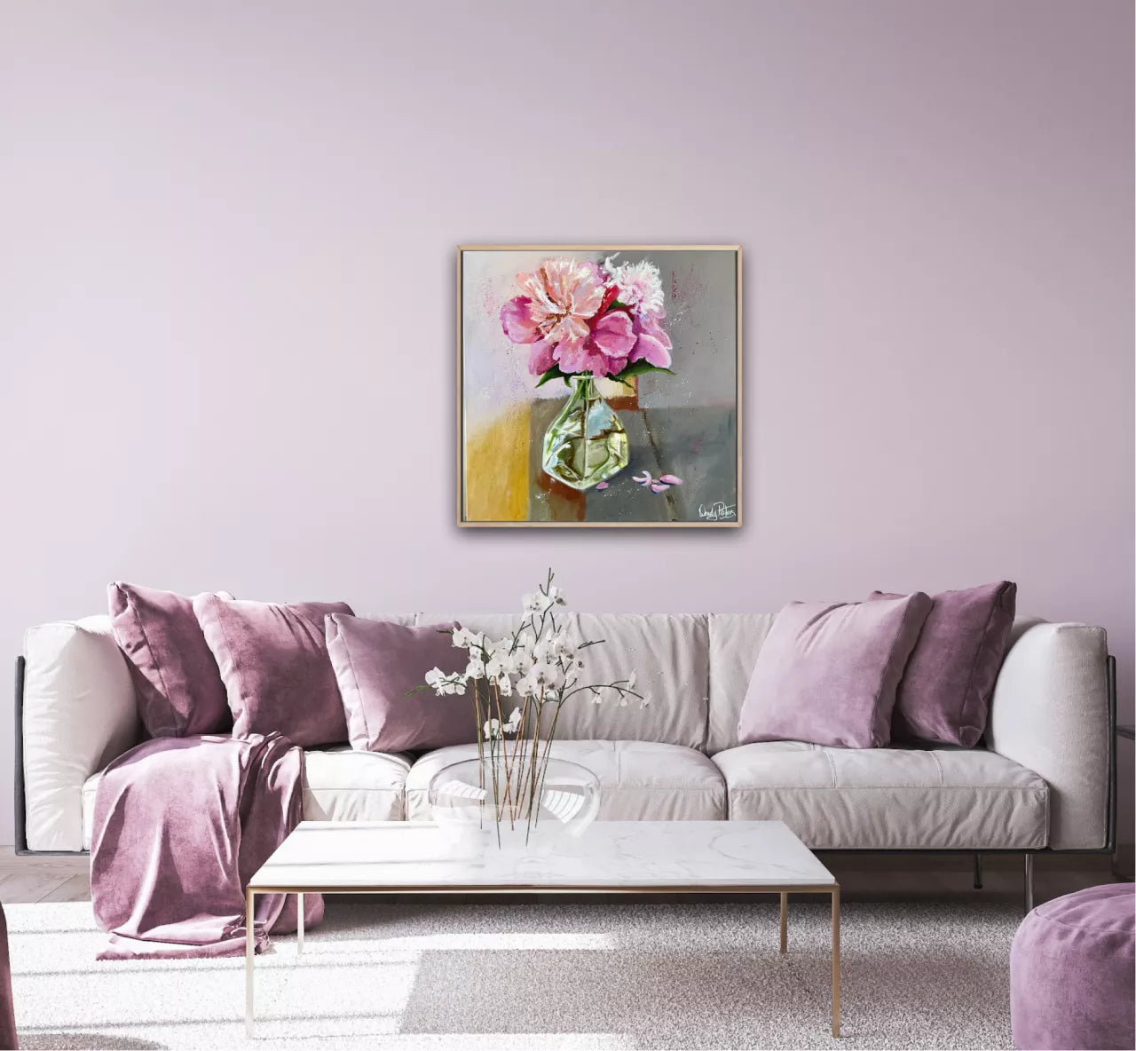 In this enchanting semi abstract painting, delicate pink flowers are arranged in a clear glass vase. The soft, rosy petals of the blossoms exude a sense of tranquillity and elegance. The play of light on the vase creates mesmerizing reflections, adding a touch of magic to the composition. The simplicity of the scene contrasts beautifully with the intricate interplay of colours and the captivating dance of light and shadow, making this artwork a serene yet captivating painting.