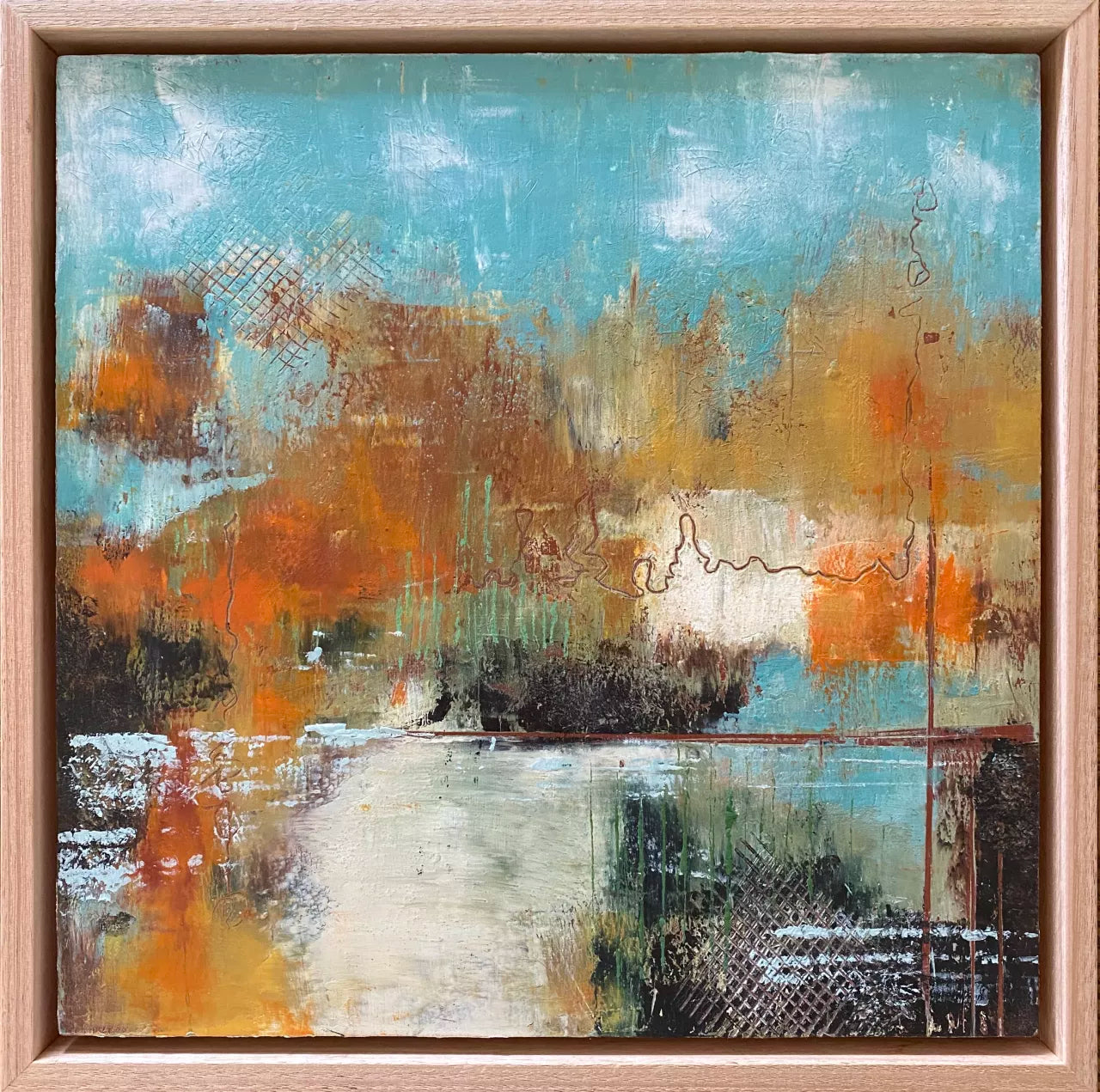 This collection embraces my love of the natural world and how it helps to heal if we take time to be amongst it and absorb its beauty and spellbinding power. Leaving behind a feeling of burnout, overwhelm with debilitating migraines and being in the present in nature is represented in these abstracted visions I see and feel. Working with cold wax and oil on wood panels allows for beautiful texture and depth to shine through. Framed and ready to hang in raw Tasmanian oak float frame.