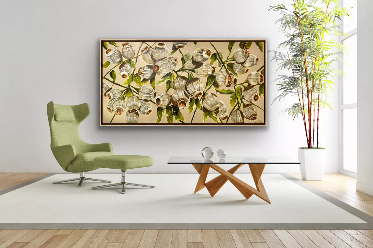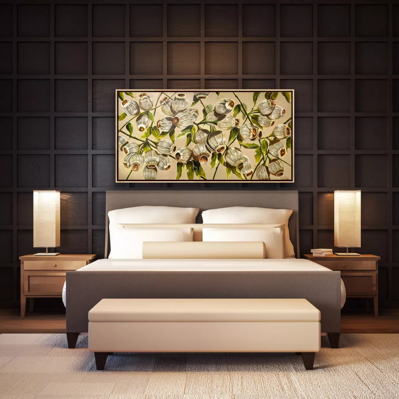 Gum Nuts are iconic elements of the Australian Landscape, there are so many varieties, unique shapes, colours and textures. I am drawn to the way light plays on the rough surface of the gum nuts, Eucalyptus trees are known for their ability to thrive in harsh conditions, and I wanted to capture the spirit of resilience in this painting.I have added texture behind the gum nuts giving a wonderful rough feel to them compared to the smoothness of the leaves. Another limited palette creation using mostly, greys, browns, greens and yellow on a warm neutral background. Framed in a high quality raw oak float frame. If you would prefer this painting without the frame, please message me through this website for the price excluding the frame. The sides of the painting as painted the same colour as the background. Framed size is 98cm (H) x 200cm (W) x 6cm (D). It would suit a contemporary, classic, or corporate settingSupplied with a Certificate of Authenticity. Thank you for visiting and I hope you love Gum Nut Symphony.