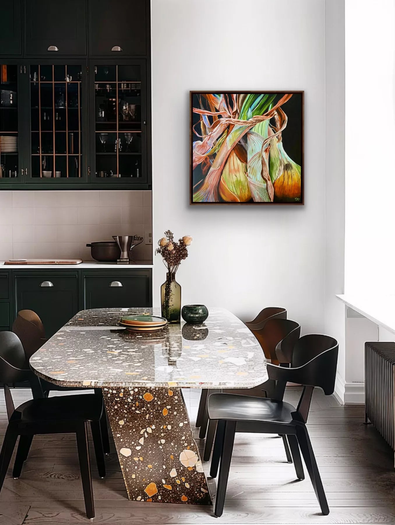 I've always been fascinated by the way light plays across their delicate, papery skins, revealing a spectrum of colours you wouldn't expect. From the rich warm rich tones of the bulb to the beautiful cool colours of the stems. The twine holding them together gives an added element of texture.Using the vibrancy of oil paint combined with glazes, adds an almost sculptural quality to the humble onion. The dark background makes the onions pop, creating a dramatic focal point whilst emphasizing the luminosity of their forms.Framed in a high quality black float frame. The size includes the frame. Supplied with a Certificate of Authenticity