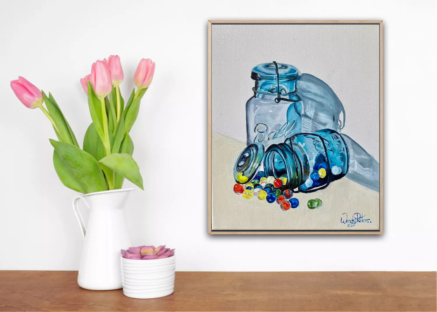 In this striking artwork, a blue glass jar overflowing with marbles takes centre stage. The jar itself is rendered with a level of detail that allows the viewer to appreciate its smooth curves and delicate texture, while the marbles seem to glow with their own inner light. Some of the marbles have spilled out onto the surface below, creating a lively and engaging composition. Whilst painting this little beauty, the title came to mind as I often say this to my friends! Framed in a Tasmanian oak float frame.