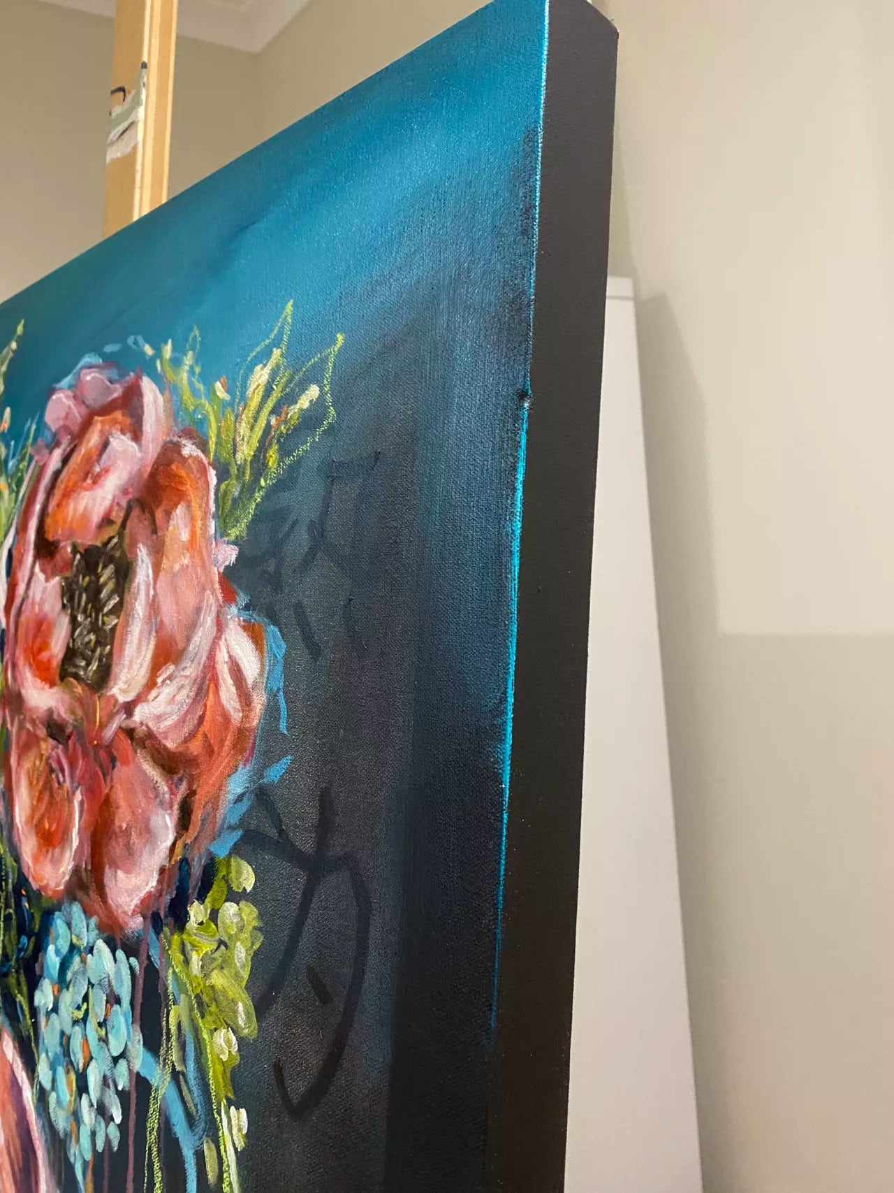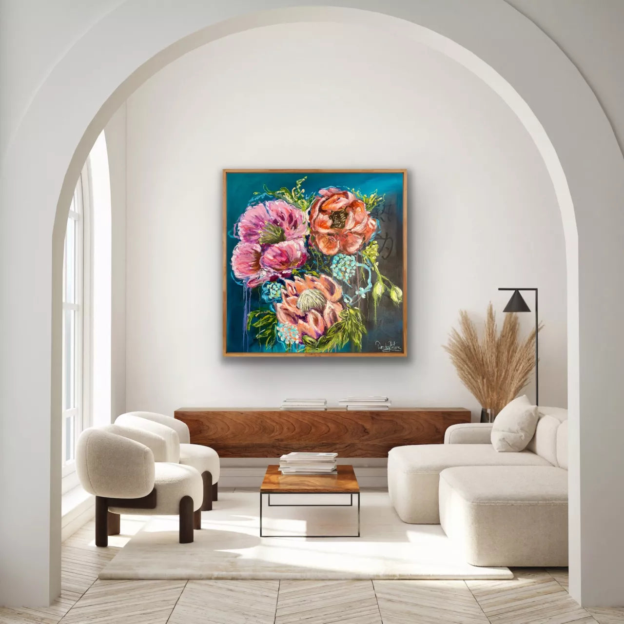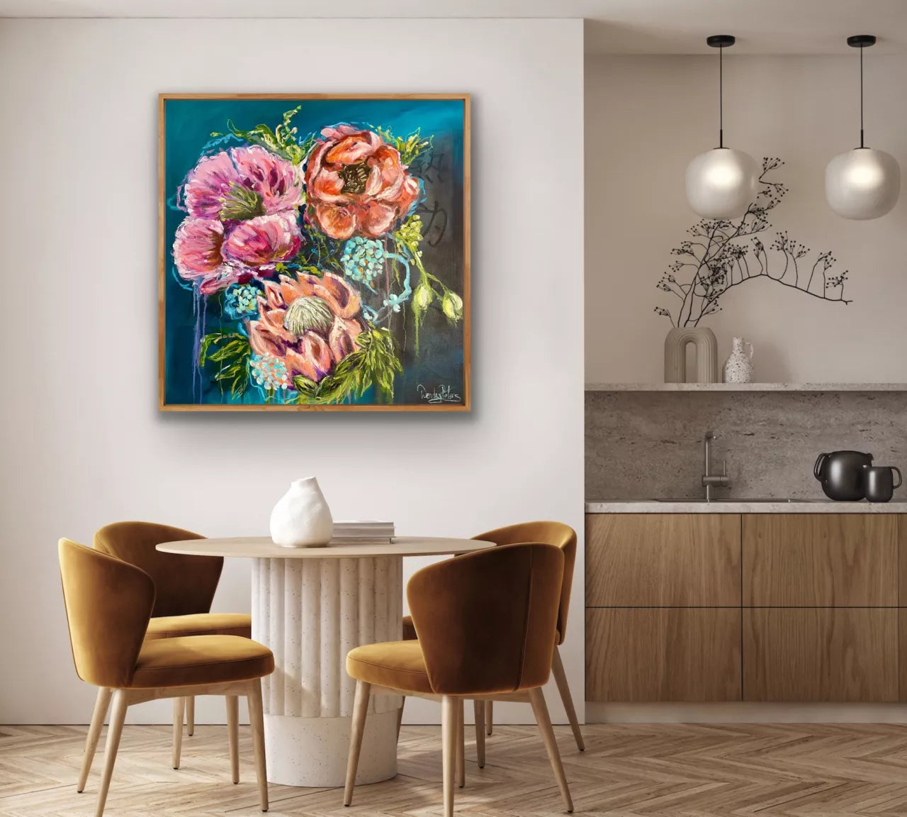 This piece, titled Midnight Blooms explores the captivating contrast between the vibrant energy of flowers and the serene depth of the dark teal blue background. Loose brushstrokes dance across a canvas of deep teal blue, creating a sense of mystery and tranquillity. Three blooms, rendered in a palette of pinks and corals are captivating. One of a Kind original painting. Mixed Media. Comes with a Certificate of Authenticity. This painting is on stretched artist quality canvas with internal wooden frame. It would also look fabulous in a timber or black floating frame. All of Wendy’s original artworks are signed on the front and signed and named on the back.