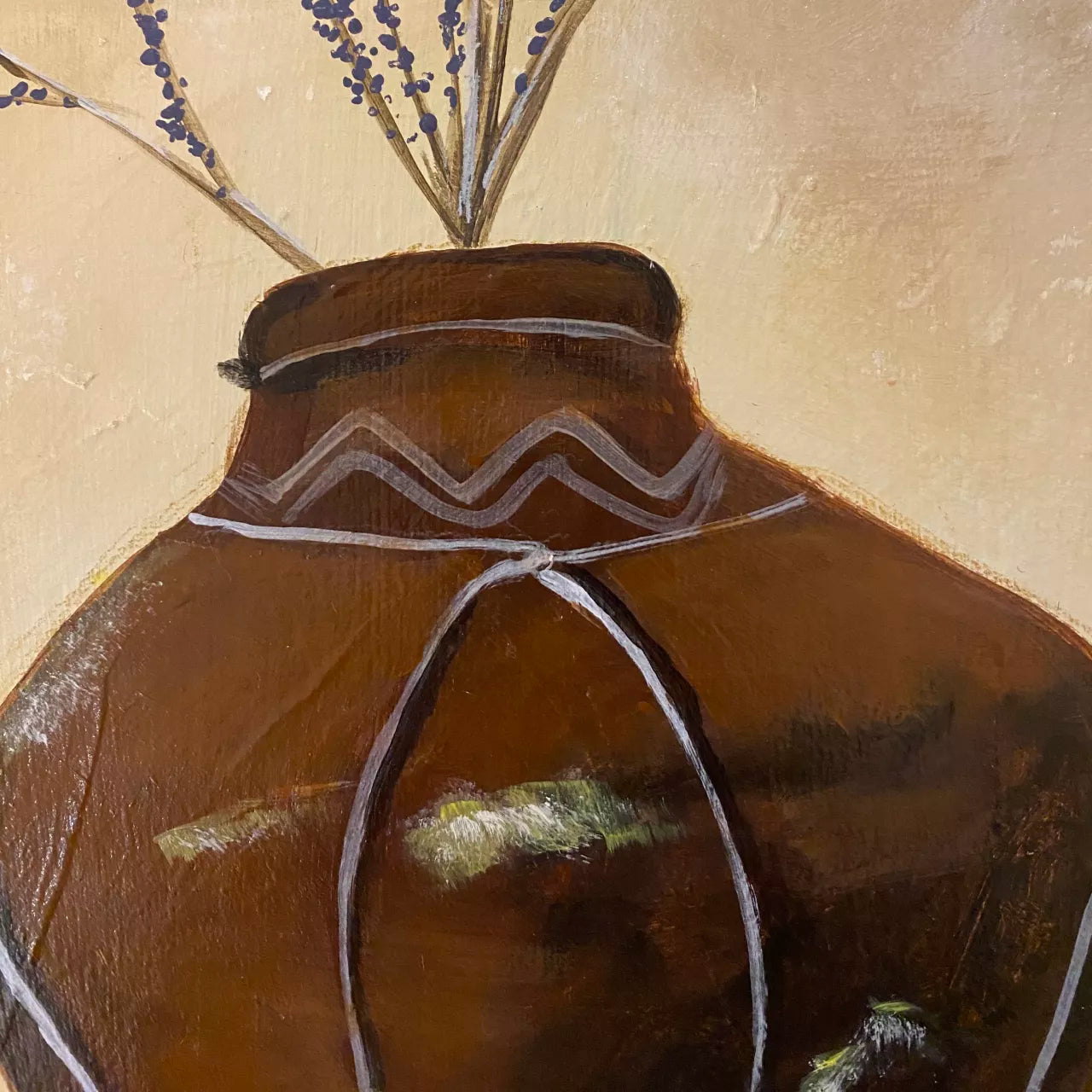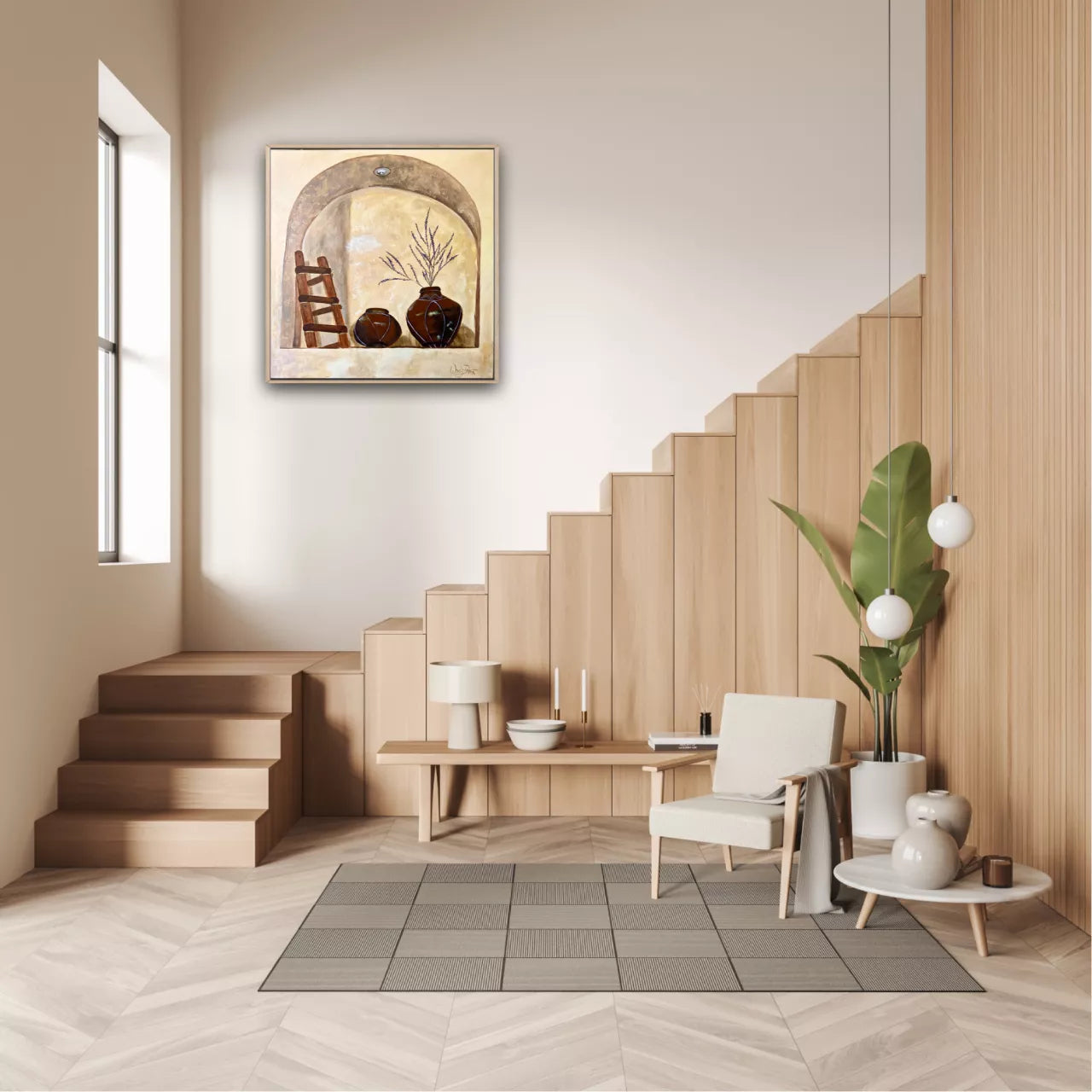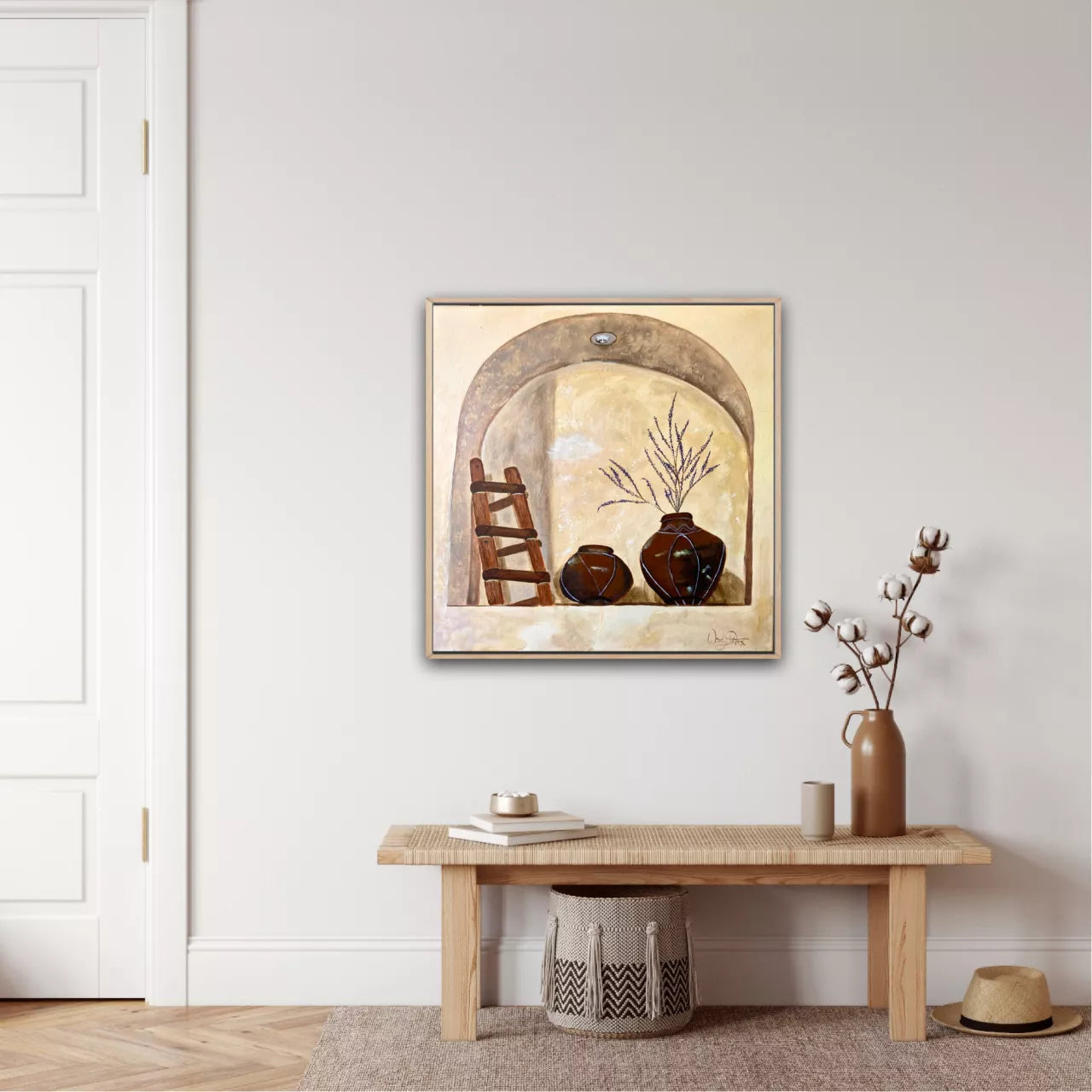 A testament of simplistic architectural beauty. The arched niche with its elegant curvature draws the eye deeper into the scene. Within its recesses, antiquated earthenware pots, one holding dried lavender. Lavender has been used for more than 2,500 years for fragrances, therapeutics, and cooking and as an ornamental shrub so adds to the feeling of historical beauty to the scene. This painting celebrates the intricate interplay between human craftsmanship and the artistry found in everyday objects. Framed in Tasmanian oak float frame.