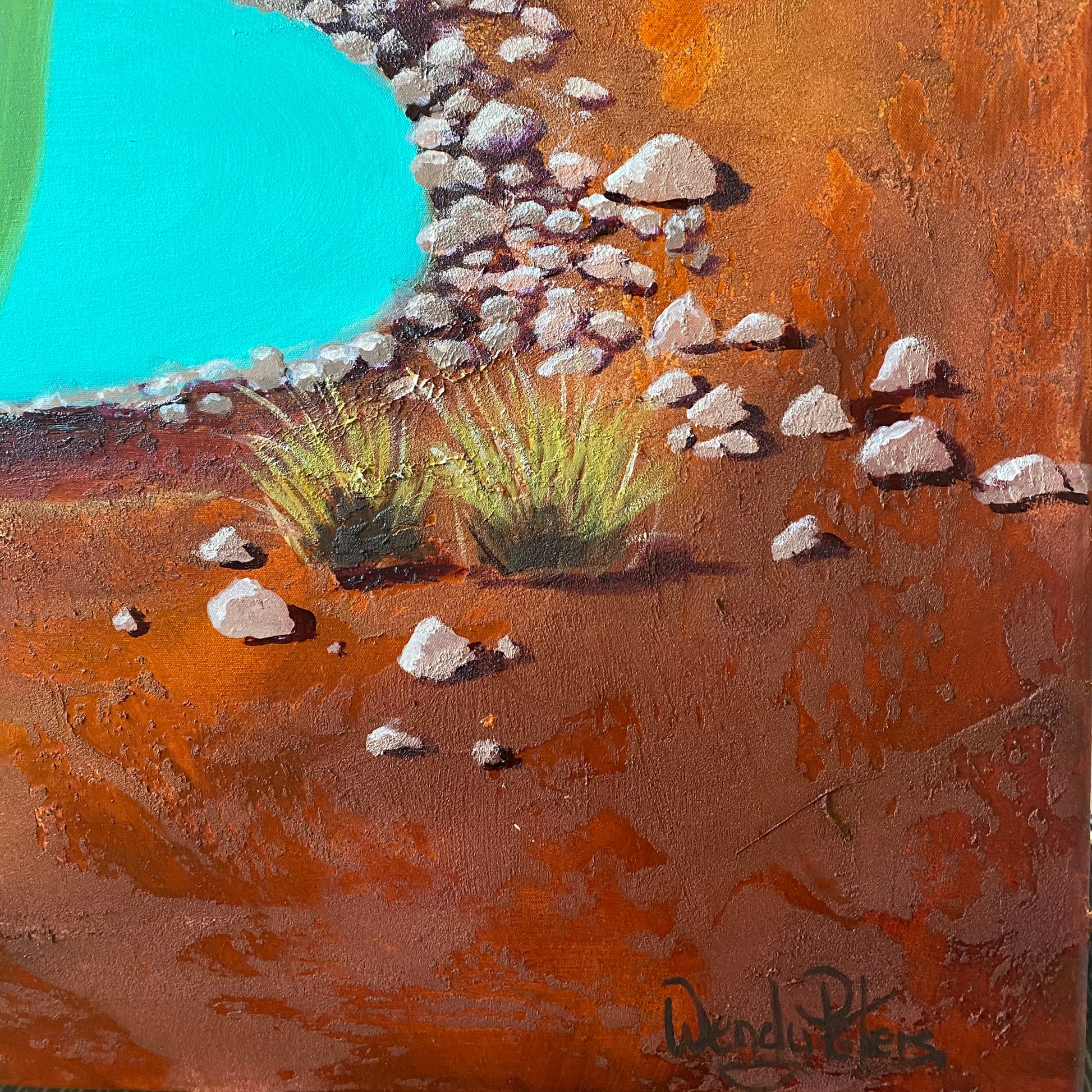 This painting features the majestic red mountains in the background, standing as ancient sentinels over the vast landscape. The desert stretches out in a vibrant burnt sienna, reflecting the scorching sun and the rich, iron-laden earth. It's a land of contrasts, and nowhere is that more evident than in the turquoise billabong that takes centre stage. This oasis, fringed with the unique and resilient grass trees, represents life and vibrancy amidst the arid expanse.