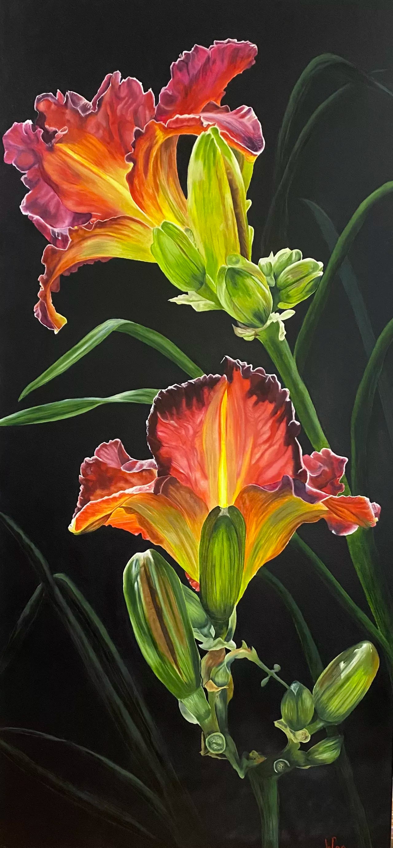 A large commission piece of close focus day lilies on black background