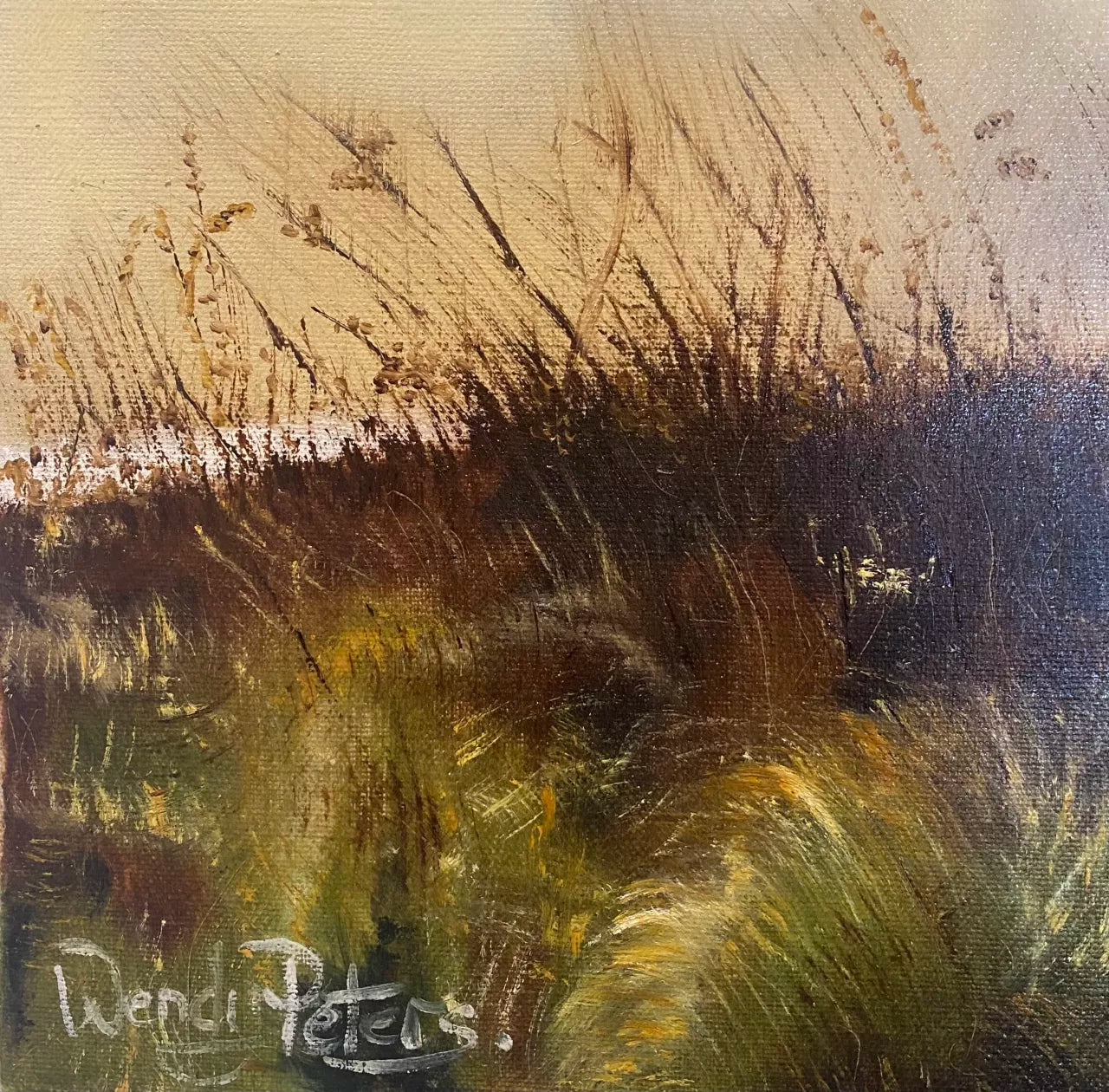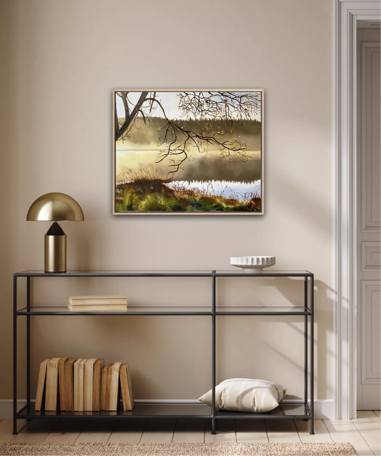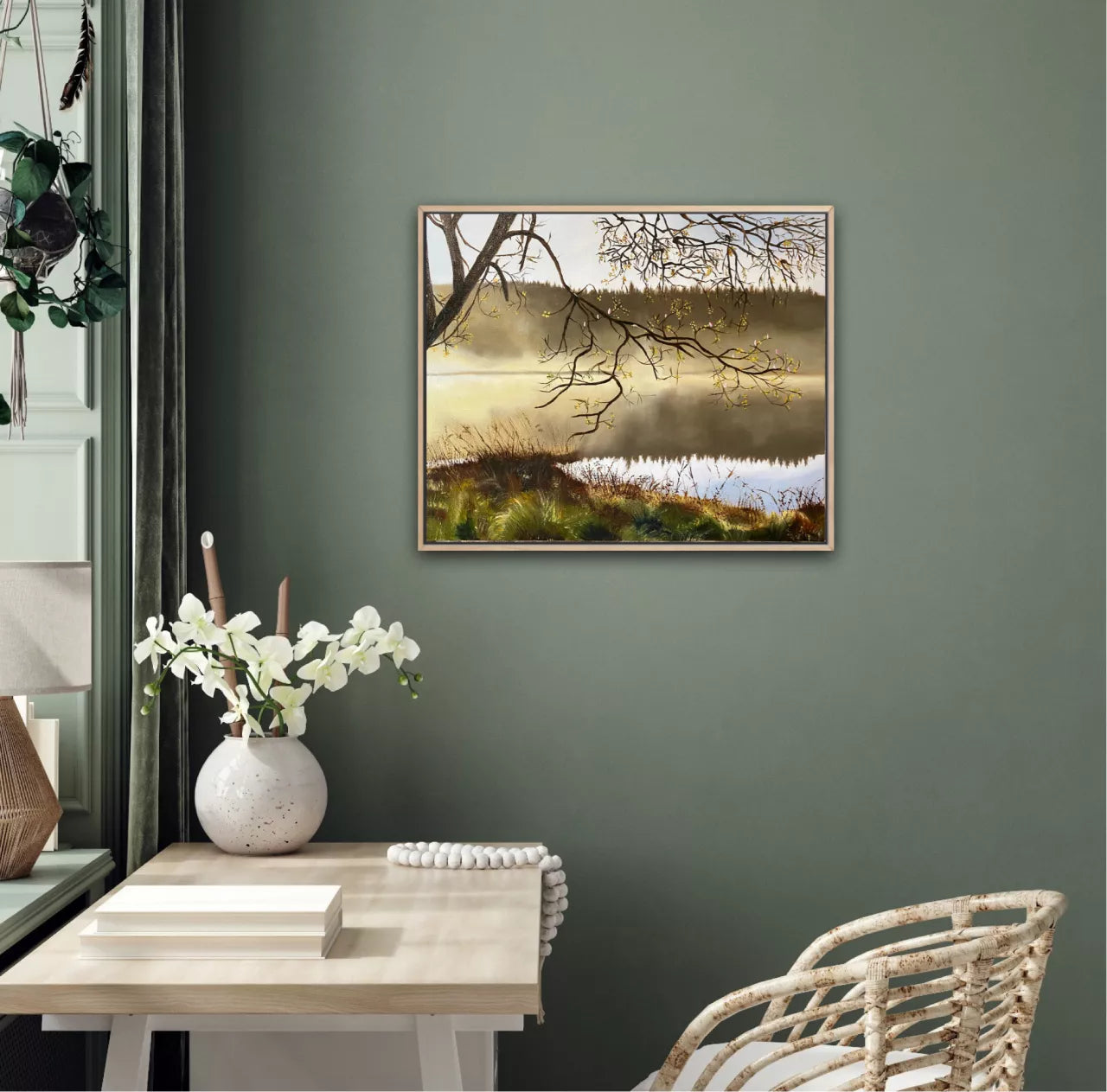 A painting of misty hills reflected in a lake, an earthy play of light and shadow, the foreground tree creates a focal point, and the grasses contribute to a harmonious and balanced composition. The painting captures a moment of quiet beauty and invites the viewer to immerse themself in the tranquillity of nature.One of a Kind original painting.Comes with a Certificate of Authenticity. This painting is on stretched artist quality linen canvas with internal wooden frame. It would also look fabulous in a timber floating frame.All of Wendy’s original artworks are signed on the front and signed and named on the back.
